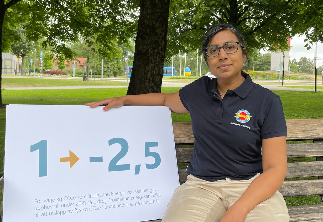 Beräkningen visar att för varje kilo koldioxid som Trollhättan Energis verksamhet orsakade under 2021, så bidrog företagets produkter och tjänster samtidigt till att utsläpp av 2,5 kilo koldioxid kunde undvikas i Trollhättan. Så påverkan blev således negativ, vilket i det här fallet är väldigt positivt.